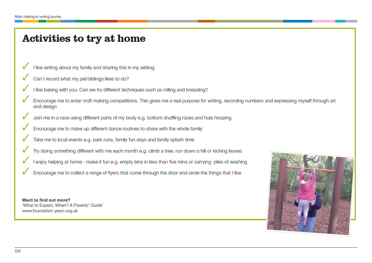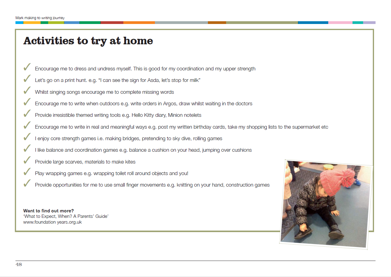 Here are some activities that parents can try at home with young children to support their physical development. Early Years Practitioners in Bolton can learn more about the Mark Making to Writing Journey by signing up for our fully funded (FREE) professional development training which covers this fantastic resource in much more detail.